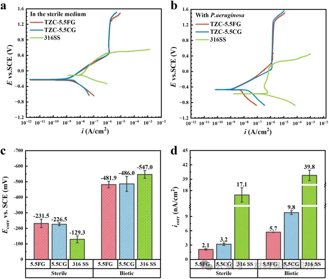 (a) 无菌培养基和 (b) 生物培养基中TZC-5.5FG、TZC-5.5CG和316SS的动电位极化曲线及拟合参数