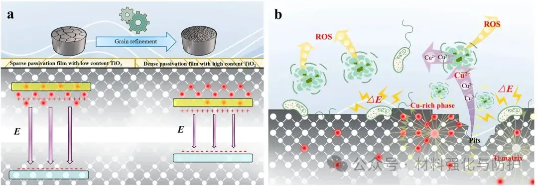 (a) TiZrCu合金的防腐机理和 (b) 抗菌机理