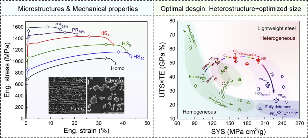 轻质高性能钢一直是汽车与航天航空领域所追求的材料,这里的高性能一般泛指高强度和良好塑性之间的组合,但传统的沉淀强化或相变强化虽能提升强度,但往往牺牲塑性。因此,如何在保证良好塑性的同时实现超高强度,一直是材料科学领域的核心难题。近年来,开始有人提出通过构建异质结构(heterostructure)实现强塑协同提升,且已经在一些合金体系内得到了验证,但如何通过精细化调控在钢材体系实现最佳强塑协同,仍缺乏系统理论与实验验证。