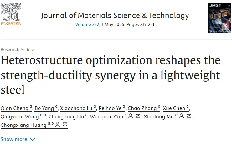 四川大学黄崇湘教授团队联合香港城市大学马晓龙教授中国钢铁研究总院曹文全研究员近日在《Journal of Materials Science & Technology》期刊在线发表题为Heterostructure optimization reshapes the strength-ductility synergy in a lightweight steel”的最新研究论文,团队通过异质结构设计与异质单元尺寸优化的协同调控,实现了轻质钢在1441MPa超高强度下仍保持36.1%延伸率的突破性性能,为轻质高强结构材料的设计提供了新思路。