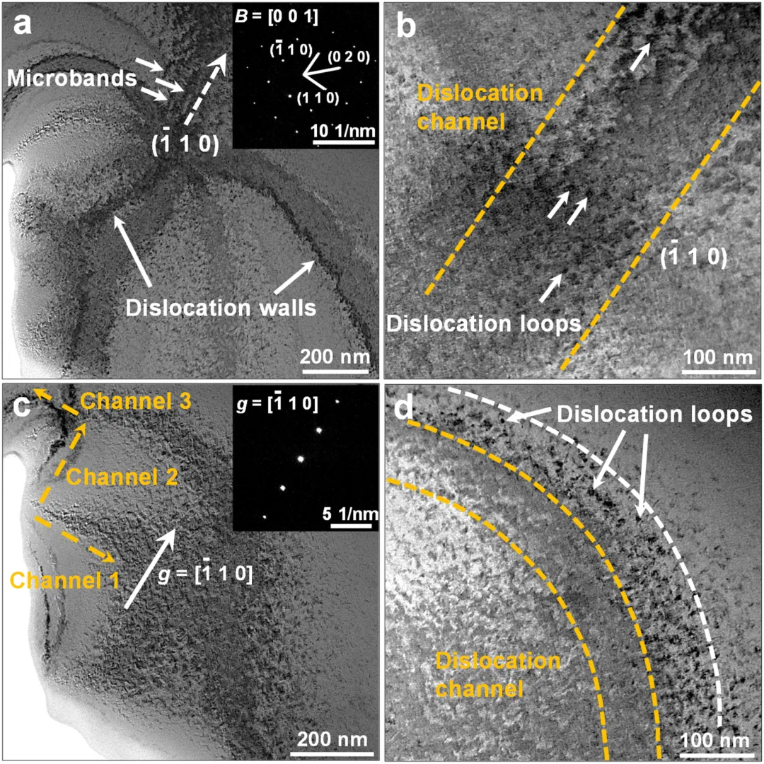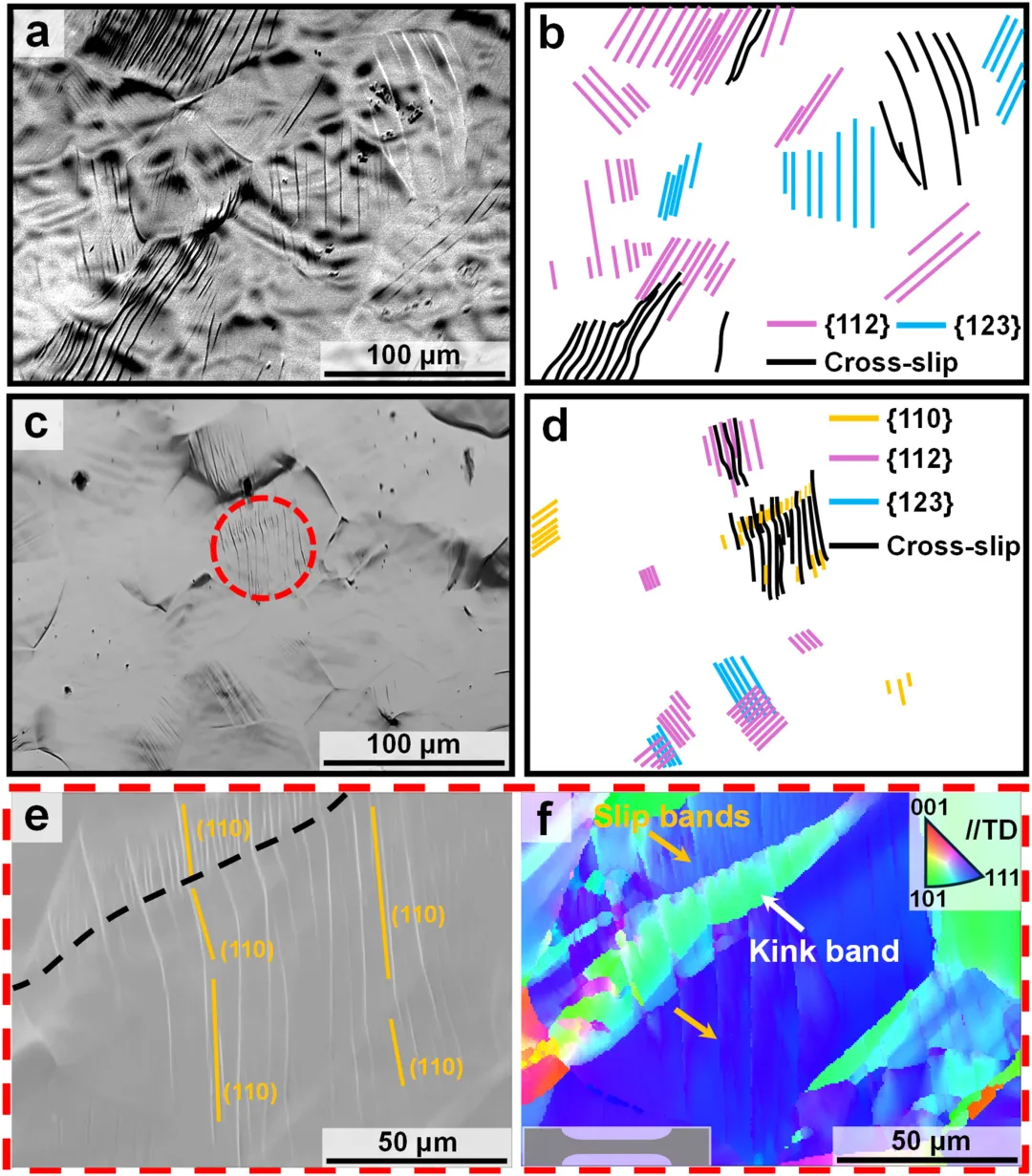 在屈服阶段,合金主要通过平面滑移变形,伴随少量交叉滑移。随着变形加深,位错缠结与短化现象明显,特别是边位错在扭折带边界处易于钉扎和累积,推动扭折带的形成。最终,材料的塑性由大量长直的边位错主导,这一异常机制区别于传统难熔合金中的螺位错主导。