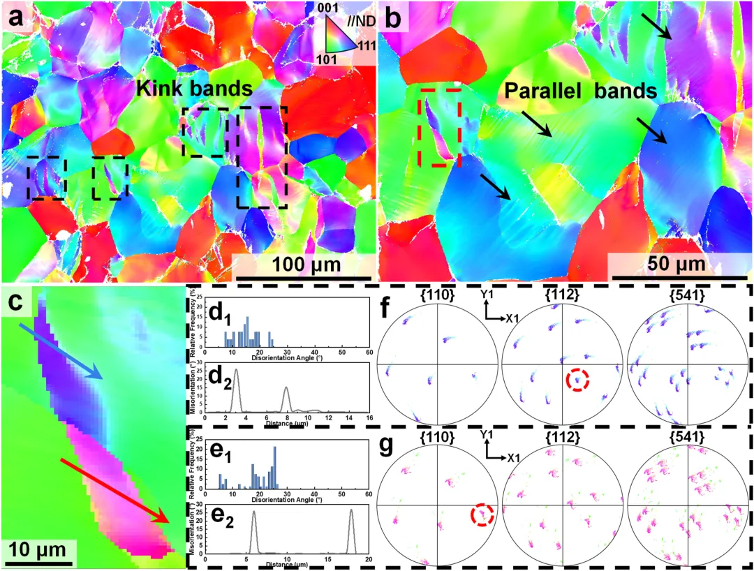 凭借独特的多组元设计和复杂的相结构相互作用而展现出优异的综合性能的高熵合金(HEAs)是近年来快速发展的新型材料体系。但正因其复杂的组元和相结构,在外加载荷作用下,其塑性变形机制仍然存在诸多未被系统研究的问题,例如影响合金强韧性的重要因素——扭折带(kink band)的形成及其与位错的相互作用规律就是其中之一。