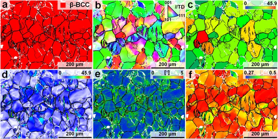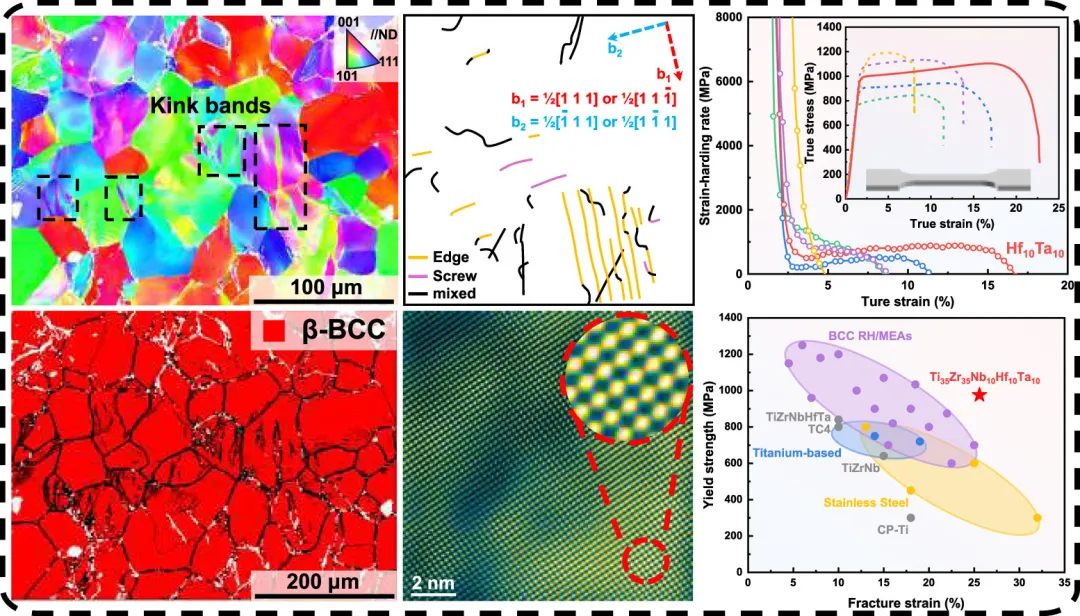 该研究系统分析了Ti-Zr-Nb-Hf-Ta合金的塑性变形机理,重点研究了Ti35Zr35Nb10Hf10Ta10合金在不同变形阶段的组织演变,系统地阐明了Hf和Ta在微观组织演化、强度-塑性协同作用、扭折带形成和位错相互作用中的作用,这一发现不仅推动了高熵合金的基础研究,也为航空航天、能源装备和生物医用金属的开发提供了新路径。