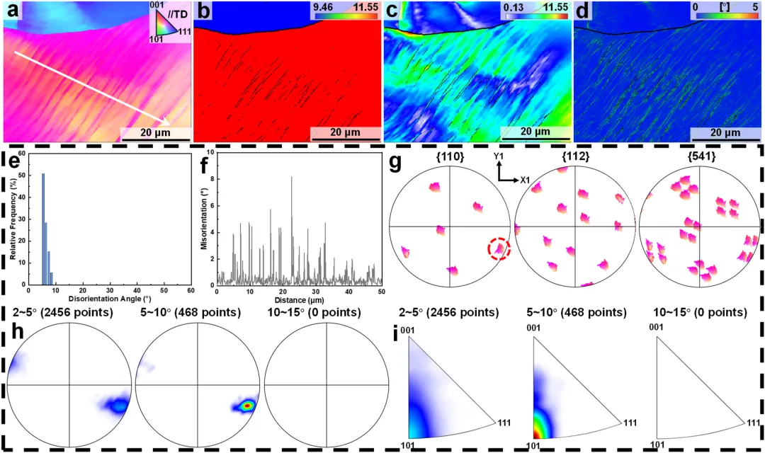 在塑性变形过程中,a/2<111>{110}和a/2<111>{112}的边位错形成了大量的扭折带,这些扭折带不断旋转晶格以适应局部高应变,并激活滑移系统以保持有利的取向,通过促进均匀塑性变形和减轻应力集中来提高材料的延展性,同时阻碍部分位错运动。此外,低角度平行带和扭折带之间的转换提供了额外的位错源和滑移路径,进一步增强了塑性变形能力。