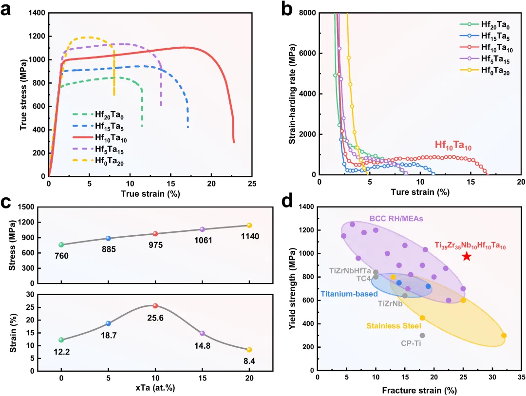研究团队制备的Ti35Zr35Nb10Hf10Ta10合金在铸态条件下即可表现出优异性能,屈服强度~1GPa,断裂延伸率高达25.6%,弹性模量仅为54.6GPa,其性能超越了多数经复杂热处理后的难熔合金,同时弹性模量接近人体皮质骨,有望兼具工程与生物医用潜力。