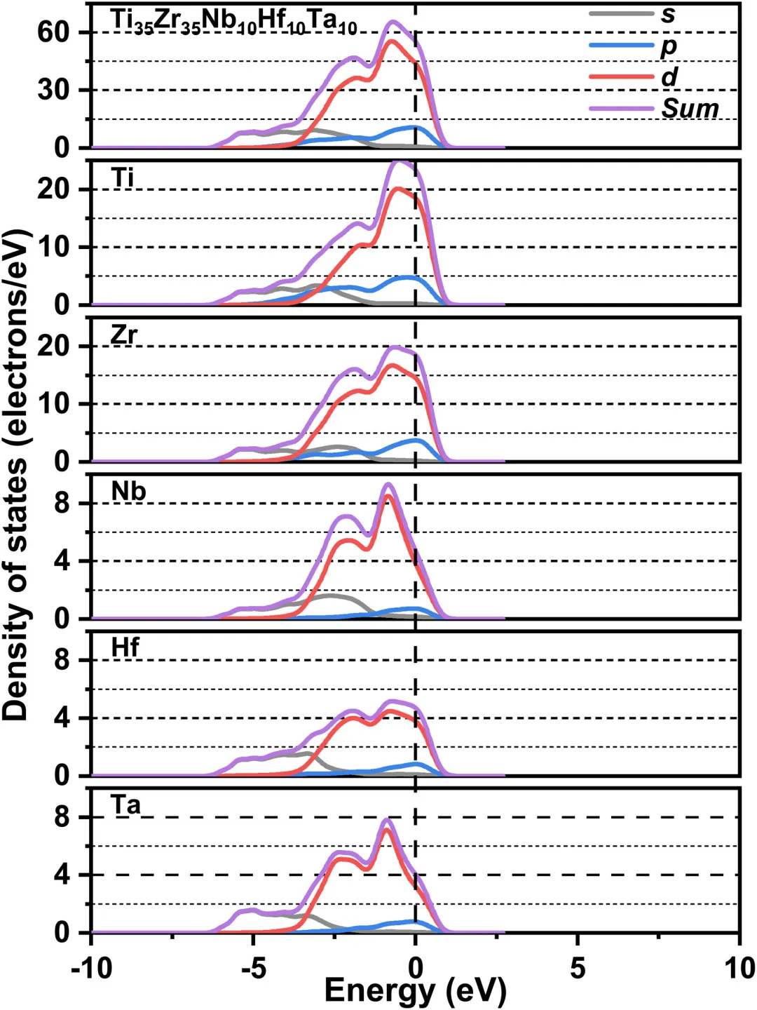 透射电镜和第一性原理计算揭示,Hf与Ta的协同作用在合金中引发LCFs,这些原子团簇增强位错钉扎,诱导扭折带形成。电子态密度分析表明,Hf提供高电子迁移率、改善塑性,而Ta增强电子定域、提升强度,两者形成互补,从而实现强韧性平衡。