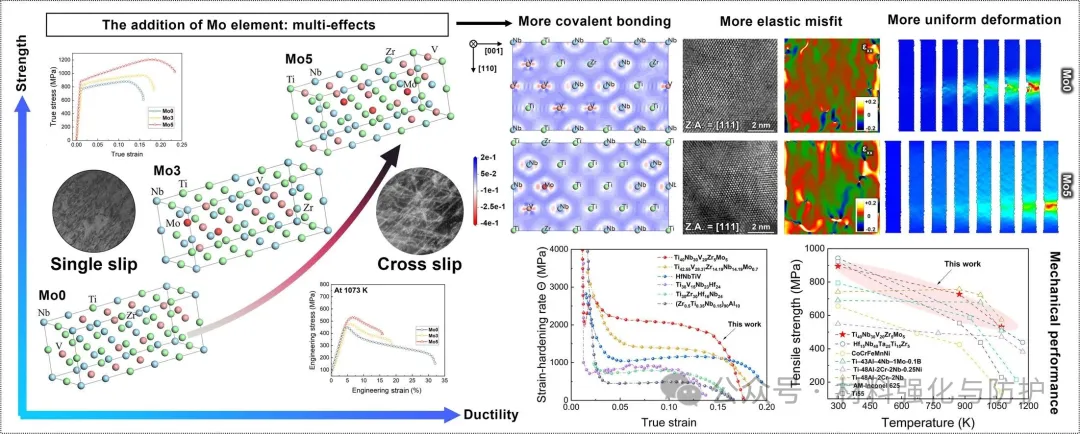 近日,哈尔滨工业大学团队联合中国科学院金属所,在《Journal of Materials Science & Technology》期刊在线发表了题为“Insights into multi-effects of single element Mo in Ti-rich Ti40Nb30V25−xZr5Mox refractory complex concentrated alloys: Strength-ductility synergy and high-temperature strengthening”的研究论文,在这项研究中,团队为了在保持轻质化和良好延展性的前提下提升Ti基RCCAs合金的力学性能,通过单一元素Mo的精准调控来调节合金的原子应变场、位错行为与电子结构。论文通讯作者为哈尔滨工业大学安琦副教授和黄陆军教授。