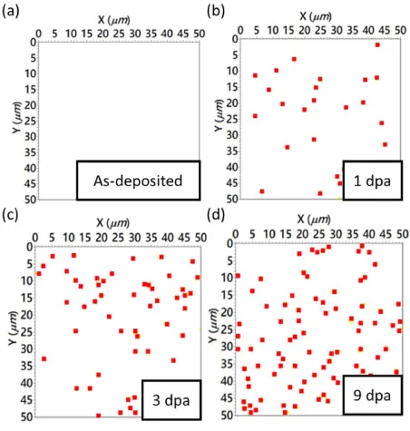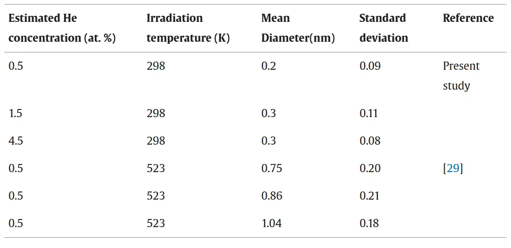 表 2. 通过 TEM 观察注入 275 keV He 的 HEA 试样获得的 He 气泡平均直径,与先前研究中在块状 CoCrFeNi 高熵合金中进行的温度辐照进行比较 [29]。