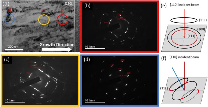 图 9. 从接受不同深度 He 离子辐照(4.5 × 10^12 He/cm^2)的样品中获得的选区衍射图样(a)BFTEM 显微图像,(b)辐照区域,(c)最高氦离子辐照区域的峰值,(d)无损伤区域(底部区域)。(e)精确区域的衍射图样示意图。(f)倾斜晶粒的衍射图样示意图。
