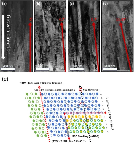 图 10. 从(a)沉积的薄膜和(b)用 5 × 10^12 He/cm^2、(c)1.5 × 10^13 He/cm^2 和(d)4.5 × 10^14 He/cm^2 He 离子辐照的样品中获得的 BFTEM,显示了晶粒倾斜。(e)晶粒倾斜结构的示意图。