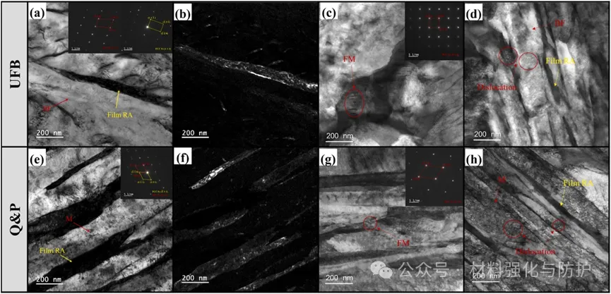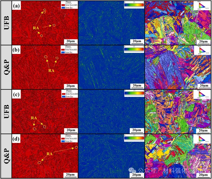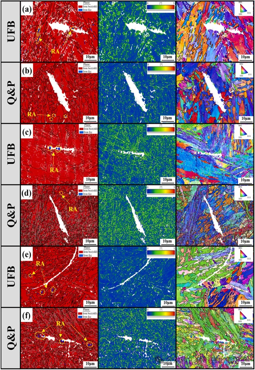 预应变通过TRIP效应使UFB钢和Q&P钢中的残余奥氏体(RA)含量分别从6.22%和5.25%降至1.77%和1.46%,位错密度与Σ3晶界含量升高,小于5μm的晶粒占比均超过92%。其中UFB钢微观结构更均匀,而Q&P钢中含有更多的低稳定性RA块体。