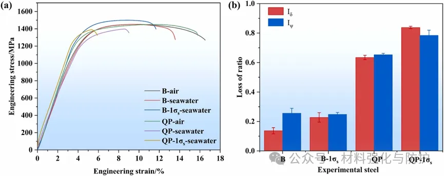 (a)钢材在空气中和模拟海水环境中的应力-应变曲线,以及(b)钢材的SCC敏感性