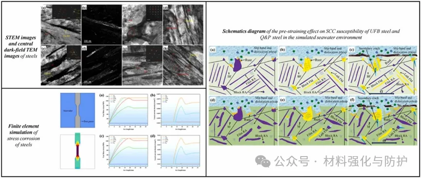 该研究以超细贝氏体UFB钢和淬火分区Q&P钢为对象,探究海洋环境中预应变(1σs)对其应力腐蚀开裂(SCC)的影响,发现预应变经TRIP效应降低了两种钢残余奥氏体含量并提升位错密度,加剧材料的应力集中与微电偶腐蚀以加速裂纹形核。UFB钢中稳定残余奥氏体膜可钝化裂纹、降低SCC敏感性,而Q&P钢因含更多低稳定性残余奥氏体块,SCC敏感性更高,其在海水环境中伸长率仅4.6%,预应变后2.2%。有限元模拟证实了电化学-力学耦合机制,明确了微观结构对两种钢SCC行为的调控作用及应力腐蚀断裂机制。