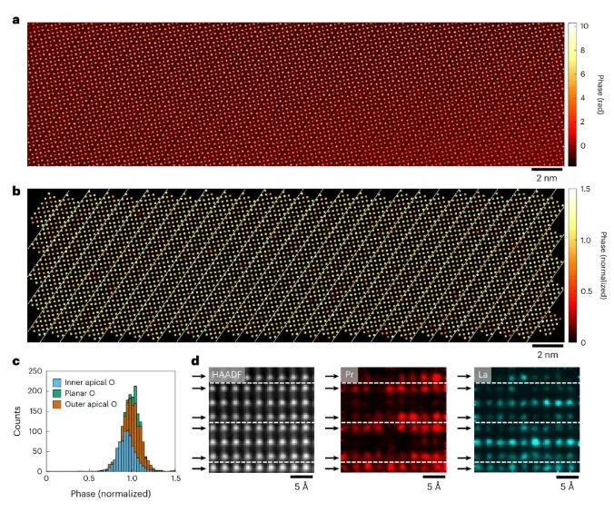 1:首次将多片层电子叠层成像(MEP) 与电子能量损失谱(EELS) 结合,实现对双层镍酸盐中氧空位和间隙氧的原子级可视化和定量分析。MEP技术提供了对轻元素(如氧)的高灵敏度成像,尤其在复杂氧有序结构中表现出优越性能。