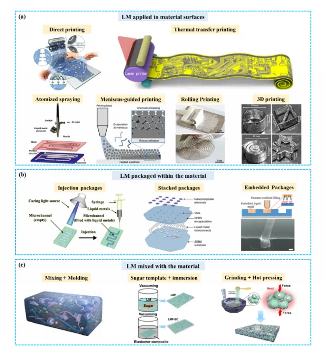 图3 液态金属在材料中应用形式:(a) 液态金属应用于材料表面;(b) 液态金属封装于材料内部;(c) 液态金属与材料进行混合
