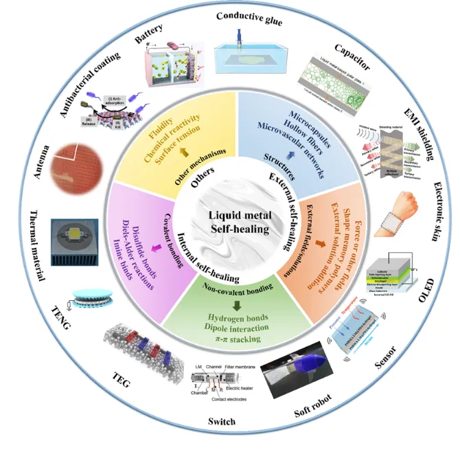 随着电子信息技术的飞速发展,电子设备早已融入现代生活和工业生产的各个方面。人们对电子设备功能和性能的要求不断提高,传统的刚性、低集成度设备已难以满足需求。柔性电子设备因其能在复杂环境中工作、可弯曲折叠并保持功能完整,成为可穿戴设备、生物医疗器件和能源领域极具潜力的发展方向。柔性电子的核心突破离不开新材料的支持。其中,金属材料凭借优异的导电导热性和机械性能扮演着关键角色。然而,传统的刚性金属在需要高柔韧性和耐用性的场景中应用受限。液态金属(liquid metal,LM),特别是镓(Ga)及其合金的出现,为材料科学和相关领域带来了革命性机遇。它们在室温或接近室温下保持液态,拥有媲美金属的高导电/导热性、出色的流动性以及相对较低的毒性。更令人惊喜的是,当液态金属暴露在空气中时,其表面会迅速形成一层极薄的氧化层。这层氧化膜能在受损后驱动液态金属“自愈合”—流动填充裂缝、重建导电通路,甚至恢复机械结构。