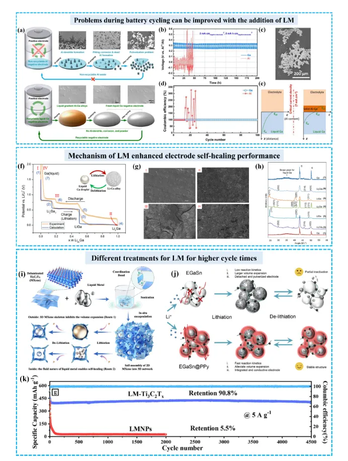 图 6. 液态金属在电池中的自修复机制及应用。(a) 金属作为负极的电池中问题的示意图SEM图像,以及改进这些问题的新型液态镓基负极; (b和d) 铝箔和液态镓的对称电池的循环性能和库仑效率的比较; (c) 经过 28 次循环后的铝电极的SEM图像; (e) 镓阳极在不同电流密度下合金化过程中的表面凝固演变示意图。(f) 循环过程中的不同阶段的LiGa电极以及合金化的示意图;(g和h) 不同循环阶段电极表面SEM图像和XRD图谱(对应图 7(f)中的图表)。(i) LM-Ti3C2Tx的制备过程以及电池循环过程中的锂化和脱锂过程的示意图。(j) EGaSn在循环过程中的示意图以及EGaSn@PPy在循环过程中的示意图。(k) 在相同条件下LM-Ti3C2Tx和LMNPs电极的循环性能比较。