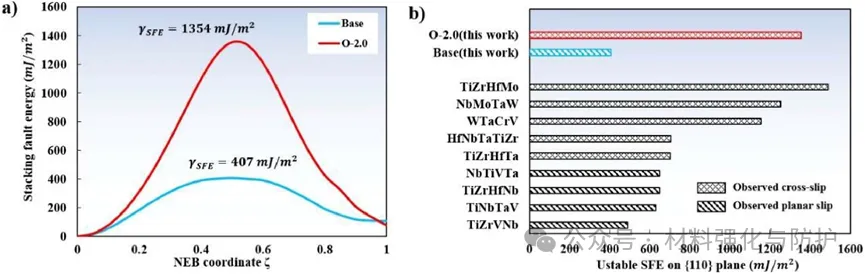 基体合金以平面滑移为主,区域占比26.5%,氧掺杂合金后平面滑移占比降低到了13.9%,而交滑移占比达23.6%。密度泛函理论(DFT)计算表明,氧使合金堆垛层错能(SFE)从407mJ/m2提升至1354mJ/m2,增幅达到了233%,远超交滑移激活阈值(700mJ/m2),促进了位错交滑移以改善塑性。另外,氧通过间隙固溶强化提升强度,氧原子引发显著四方晶格畸变,经Labusch模型估算,氧使强度提升量为152.3MPa,该值与实验值(164MPa)高度吻合。