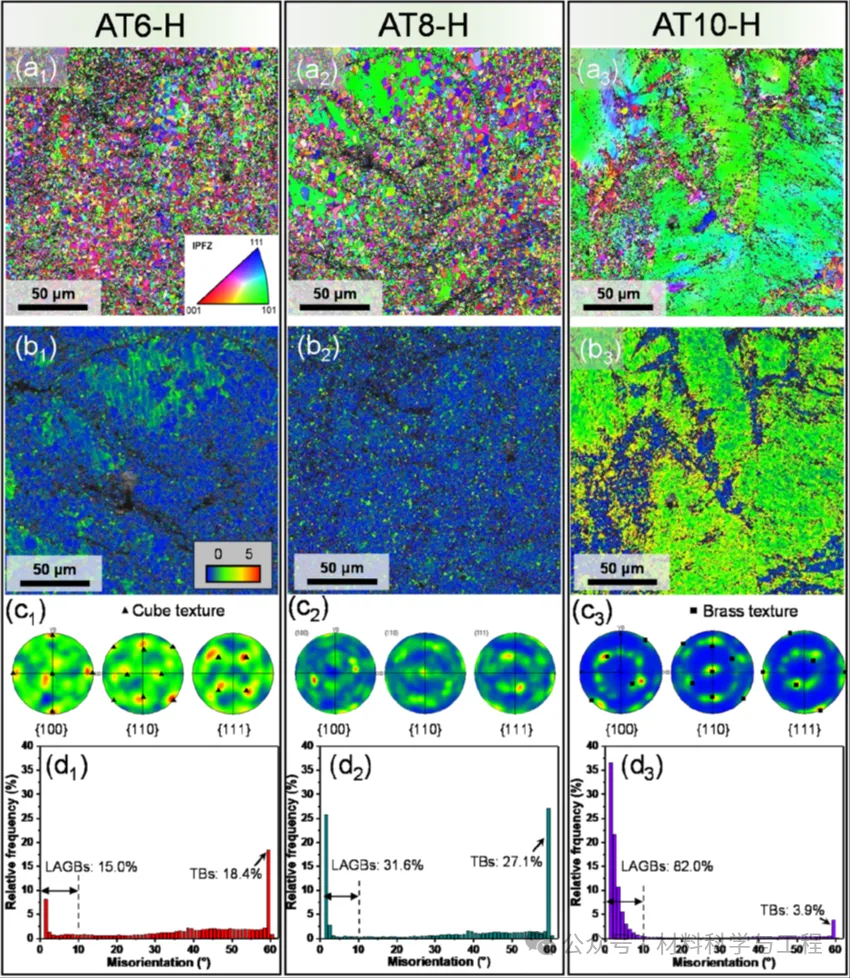 3. AT6-HAT8-HAT10-H合金的(a) 反极图(IPF)、(b) 晶粒平均取向差(KAM)图、(c) 极图及(d)取向差分布图。AT6-H呈现完全再结晶特征,AT8-H呈现部分再结晶(双峰异构)特征,AT10-H呈现变形态特征。