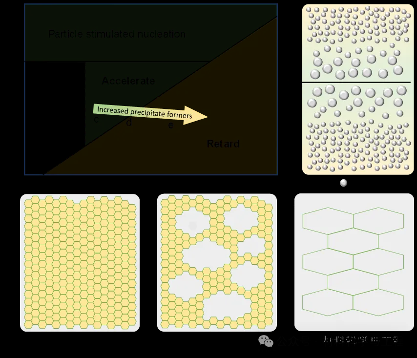 1. (a) 由沉淀相形成元素含量调控的、不同尺寸与体积分数的析出相对再结晶动力学影响的示意图;(b) 晶内和晶界处沉淀相特征示意图;(c-e) 不同沉淀相形成元素含量(对应图a)诱导完全再结晶、部分再结晶、未再结晶微观组织的示意图。