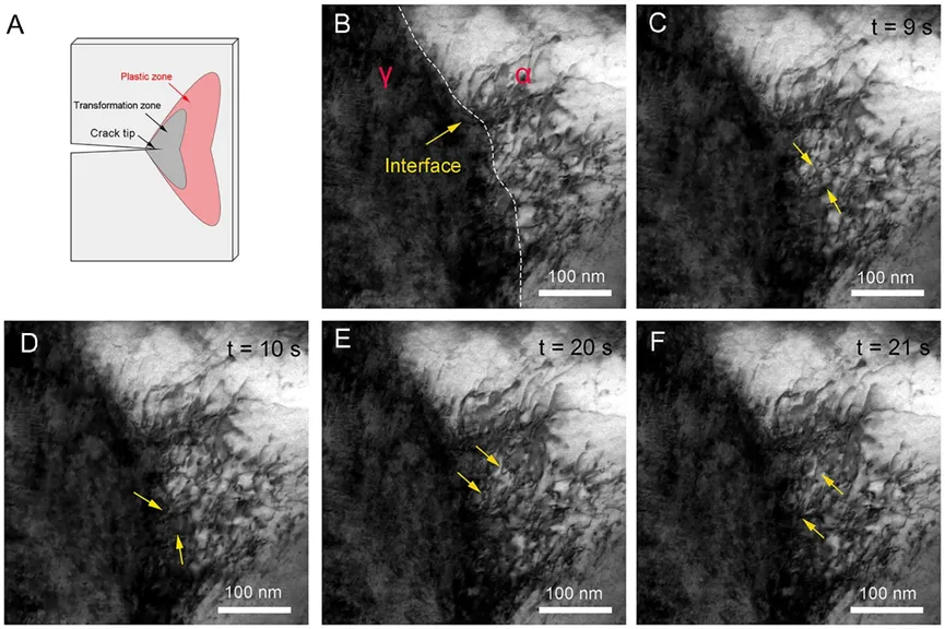 该研究首次观察到了裂纹前端中大量位错吸收(DACF)现象和马氏体/奥氏体界面位错传输(DAMAI)效应,前者缓解了α及界面应力集中和阻碍了裂纹扩展,后者提升了材料的延展性,二者协同作用突破了合金强韧性权衡难题。