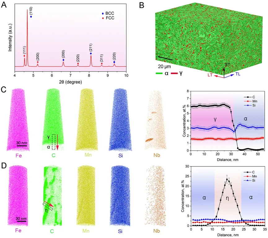 该研究团队先对Fe-0.67C-1.48Mn-1.53Si-0.038Nb(wt.%)成分的钢做归一化预处理,再用淬火-分配-回火(Q-P-T)工艺完成制备。之后用XRD、EBSD、TEM、3D-APT、XLPA技术分析钢里的相组成、微观组织、元素分布和位错密度,通过拉伸试验测出钢的力学性能,并借助原位TEM观察裂纹扩展时位错的运动情况,最后结合分子动力学模拟,验证了位错传输的合理性。