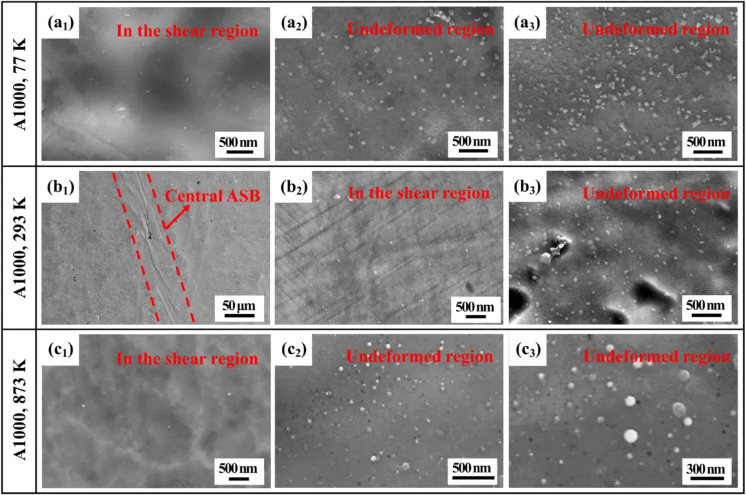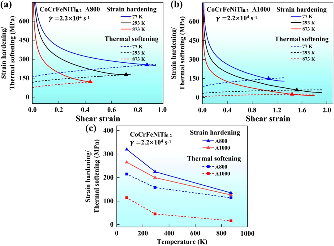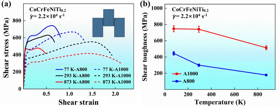 在2.2×10⁴ s-1应变率下,A800 HEA剪切屈服与破坏强度均高于A1000 HEA,但冲击剪切韧性较低,A1000 HEA因较低热软化成分在三种温度下均延缓ASB形成。