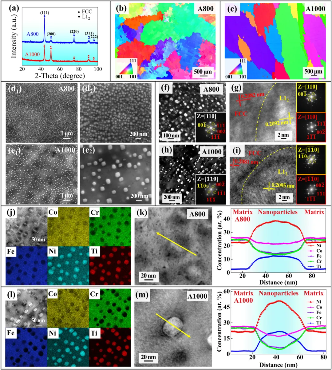 两类合金均呈FCC/L12双相结构。A800 HEA析出相体积分数高且尺寸小,A1000 HEA析出相体积分数低而尺寸大。TEM-EDS证实析出相为多组元Ni、Ti富集相且与FCC基体高度共格(界面失配仅0.48%~0.67%)。