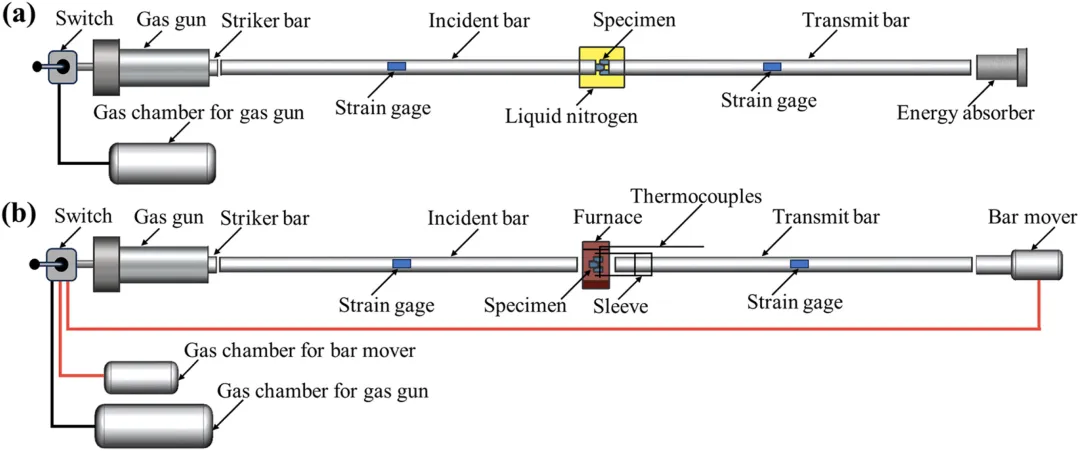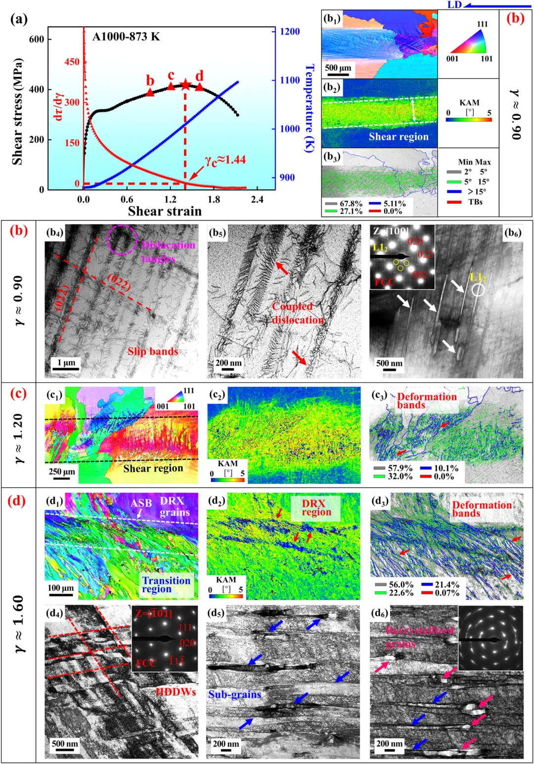 团队首先基于有限元优化了动态剪切试样几何,使剪切区应力状态接近纯剪切,随后在分离式霍普金森压杆(SHPB)装置上分别于77K、293K和873K进行动态剪切实验,并结合EBSD/TEM对不同剪切应变下的微观演化进行“冻结”截取分析。