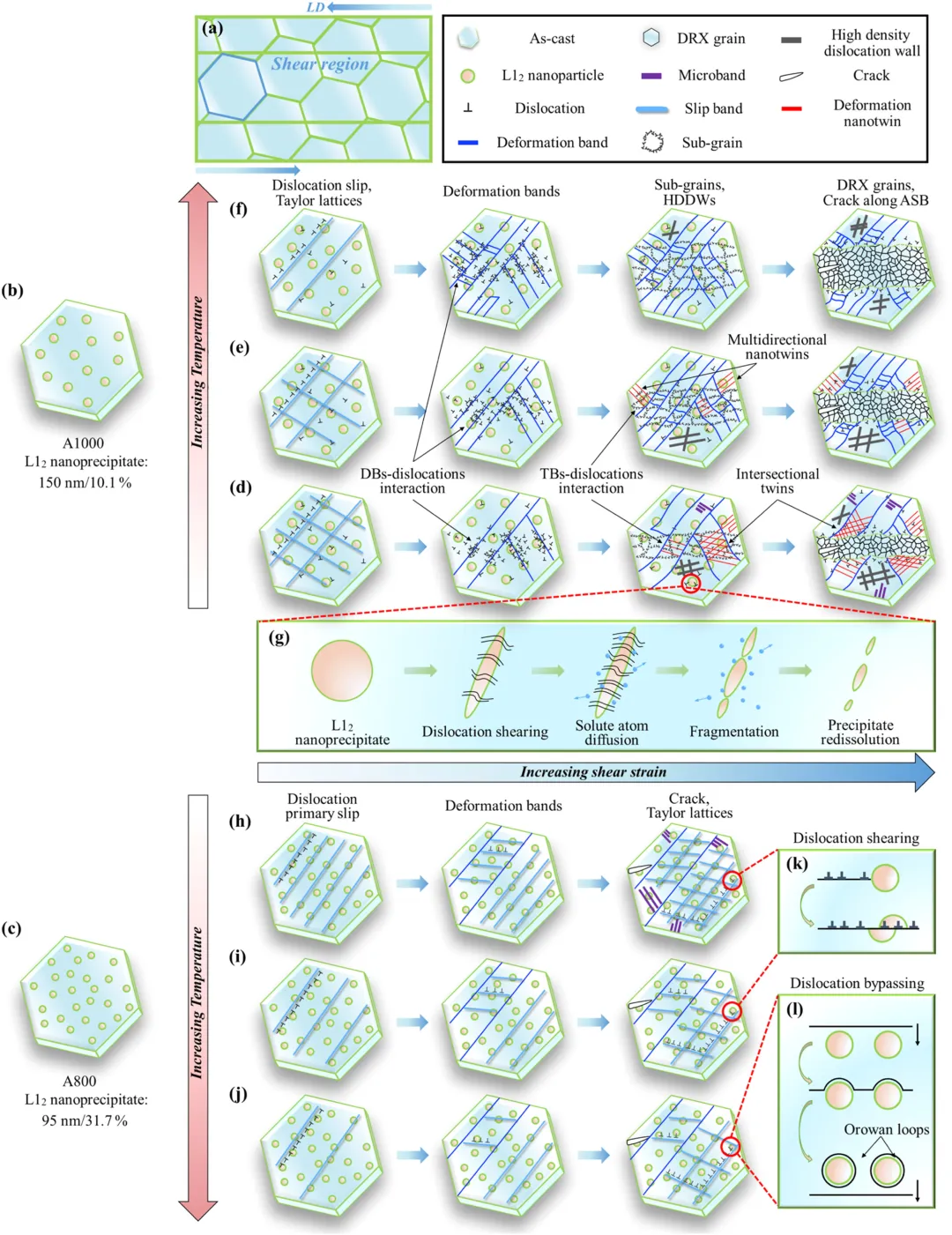 研究提出了L12析出相在高应变率剪切下的瞬时再溶解模型。高密度位错剪切、绝热升温及高剪切应力协同作用打破相界热力学平衡,使析出相在尚未达到传统溶解温度前即快速消失。