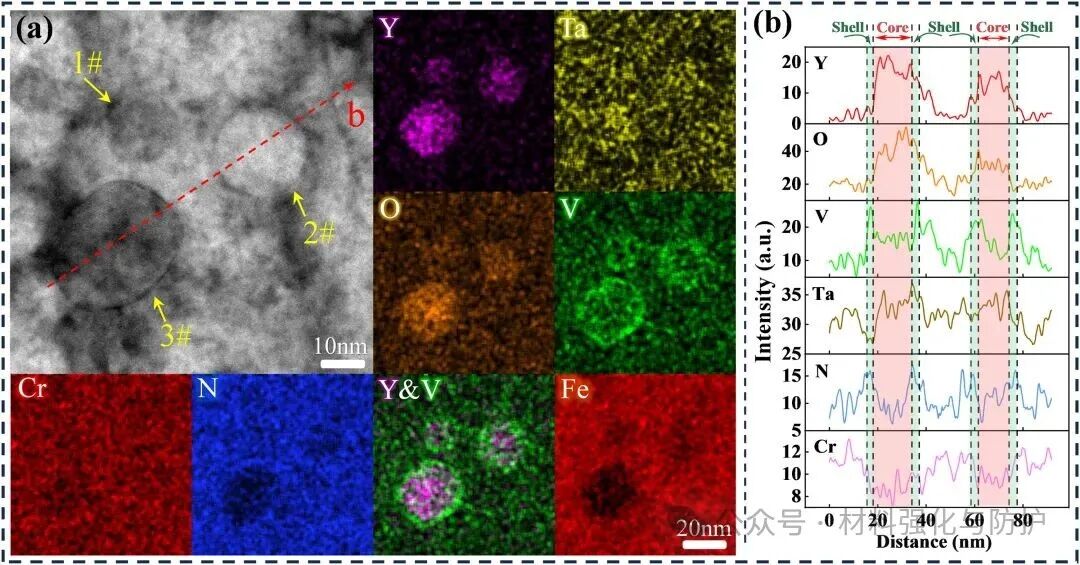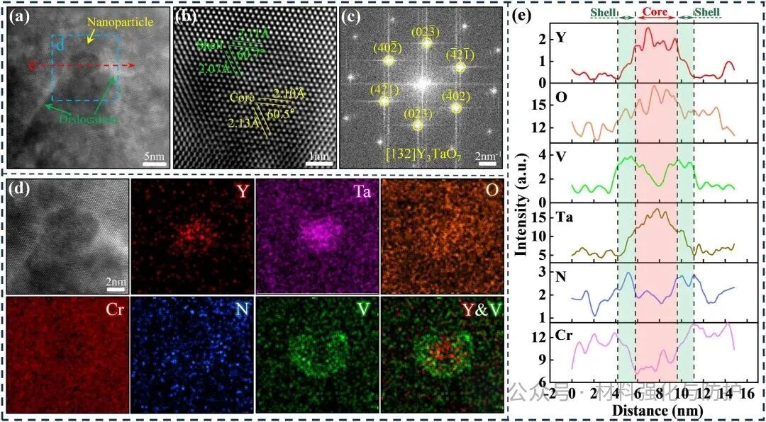 ① 构建Y₃TaO₇@VN核心-壳纳米颗粒,实现细晶强化与位错钉扎双重作用