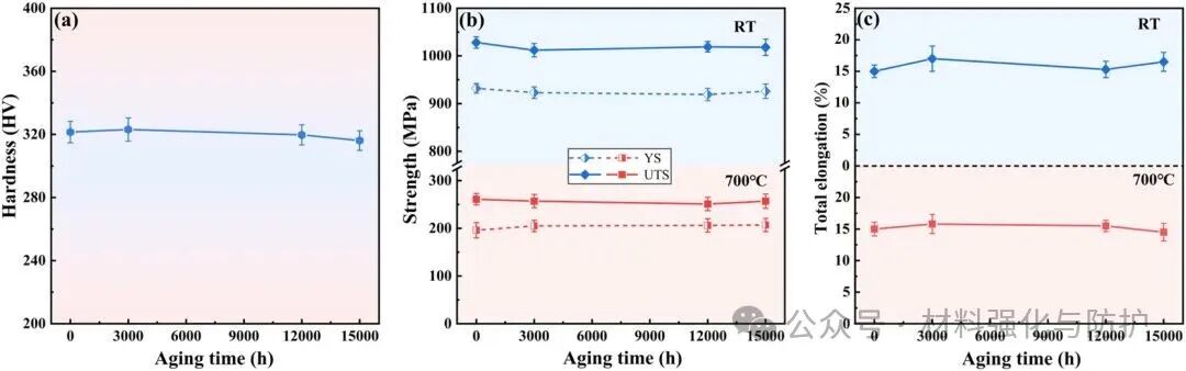 ③ 实现强度-韧性协同与高温性能稳定,15000h后仍无衰减