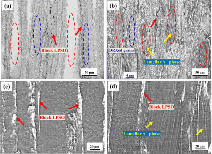 挤压态合金的显微组织特征,(a,c)QE样品,(b,d)FE样品;(a,b)OM图像,(c,d)SEM图像。红色圆圈:变形晶粒,蓝色圆圈:DRX晶粒,黄色箭头:片状γ'相,红色箭头:块状LPSO相。