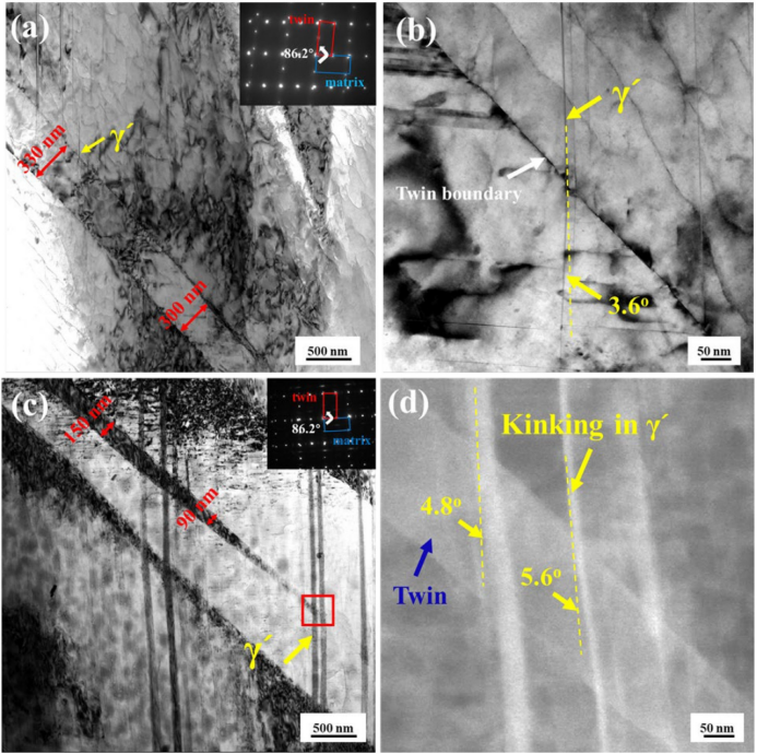 图10.二次裂纹附近孪晶和γ '相之间关系的TEM图像:(a,b)QE样品;(c,d)FE样品。