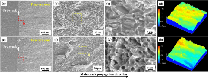 图7. QE和FE样品的断口形貌,(a,e)整个断裂表面,(b,c,f,g)SEM图像和(d,h)断裂区的三维形态;(a-d)QE样品,(e-h)FE样品。
