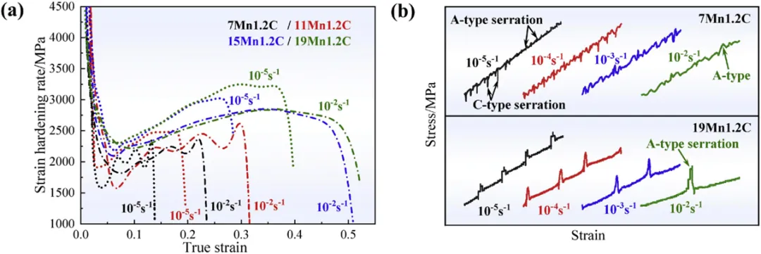 DSA作为含碳高锰钢的核心变形机制,其活性与否直接由应变速率决定。在低应变速率(<10−3 s−1)下,溶质原子(主要是C、N)有充足时间扩散,形成柯垂尔气团,既能钉扎位错,又能促进孪生,反映在应力-应变曲线上就是明显的锯齿状波动(即Portevin-Le Chatelier效应),硬化效果显著;而当应变速率超过10−1 s−1后,位错运动速度过快,溶质原子无法及时跟进,柯垂尔气团无法重建,DSA失效,锯齿波动消失,材料的硬化能力也随之骤降,这一机制的厘清,为通过成分调控优化高锰钢动态性能提供了明确思路。