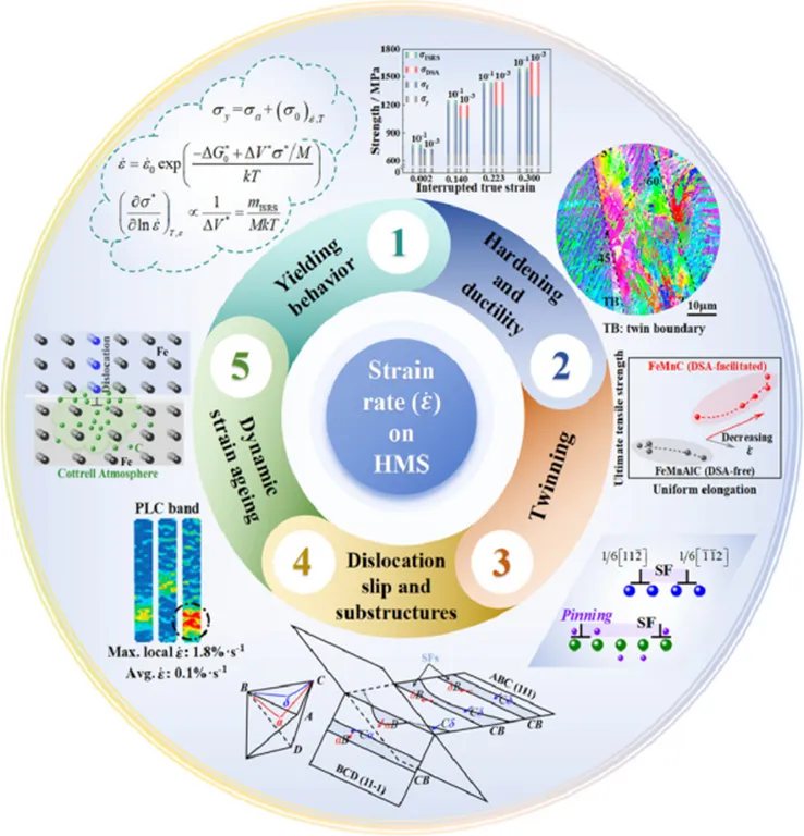 在汽车碰撞防护、国防装备抗冲击等依赖动态载荷的关键场景中,高锰钢(HMS)凭借“强而不脆”的独特优势,占据材料选择的核心地位。尤其是TWIP钢、Fe-Mn-Al-C轻质钢等品类,更因出色的应变硬化能力,成为工业界与学术界的研究焦点。但长期以来,高锰钢在高应变速率下的性能表现始终存在研究缺口,汽车碰撞时应变率可达102-103 s−1,国防装备甚至需承受105 s−1以上的极端冲击。而这一过程中,绝热效应、动态应变时效(DSA)、相变等复杂现象会彻底改变材料的力学行为与微观结构,传统准静态研究结论难以直接套用;此前相关研究也多聚焦单一应变速率或某一性能指标,缺乏系统性的整合分析。