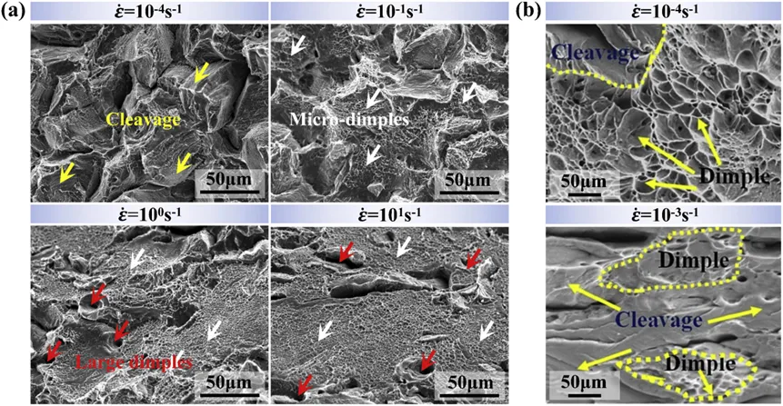 应变速率对高锰钢强度、延性的影响,本质是应变速率硬化、绝热软化以及DSA激活三者的竞争结果。在屈服强度方面,高锰钢普遍呈现正应变速率敏感性(PSRS),高应变速率会缩短热激活时间,使位错更难跨越障碍,而进入动态区间(>103s−1)后,粘性声子阻力成为主导因素,进一步推高屈服强度。应变硬化与延展性的表现则更为复杂,无碳高锰钢(如FeMnSiAl)因高应变速率抑制动态回复,位错与孪生增殖,呈现PSRS特征,强度与延展性同步提升;而含碳高锰钢(如FeMnC)在高应变速率下,DSA会因位错等待时间短于溶质扩散时间而被抑制,同时绝热加热使层错能(SFE)升高、孪生受抑,出现负应变速率敏感性(NSRS),抗拉强度和延性均下降。断裂行为的变化也与应变速率密切相关,低应变速率下,DSA会加剧应力集中,导致材料易沿晶脆断;高应变速率则缓解应力集中,转为韧窝型韧性断裂;但当应变率超过3000 s−1时,易形成绝热剪切带(ASB),引发准解理脆断,这一结论为不同场景下的材料选型提供了关键依据。
