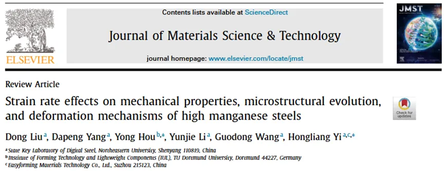 近日,东北大学数字钢铁全国重点实验室易红亮教授团队、育材堂(苏州)材料科技有限公司与德国多特蒙德工业大学合作,于《Journal of Materials Science & Technology》(Volume 237, 2025)发表长篇综述文章。该文系统梳理了应变速率对高锰钢的影响规律,为动态载荷下的合金设计与性能优化提供重要参考。文章从“力学性能 - 微观结构 - 变形机制”三个维度,全面解析应变速率的作用机制,对指导工业生产、服役应用(如汽车结构件、防弹材料)及学术探索具有重要意义。