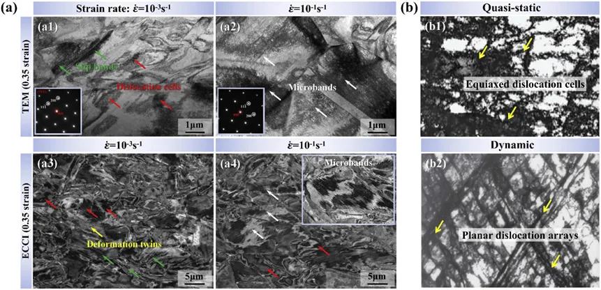 在微观结构层面,应变速率直接决定了高锰钢的微观形态,核心体现在形变孪生的双向调控与位错亚结构的转变上。孪生方面,准静态区间(10−4-10−1 s−1)内,中低SFE合金随应变速率升高,热激活受抑,促进孪生启动;而进入动态区间(>102 s−1)后,绝热加热使SFE骤升,孪生被显著抑制,孪晶体积分数下降;晶体学形态方面,低应变速率下形成的孪晶更细小,高应变速率下孪晶更粗、间距更大。位错与亚结构的变化同样明显,高应变速率下,位错密度显著提升,且分布更均匀,亚结构也从准静态条件下的“位错胞”,转变为动态条件下的“平面滑移结构”,呈现出类似低SFE合金的特征。值得注意的是,动态应变下形成的ASB是材料失效的危险信号,其核心区域因局部高温(接近熔点)可能形成非晶相,周边则为纳米晶,易成为裂纹萌生源,如何通过增强应变硬化(如促进孪生)延缓ASB形成,也成为综述重点探讨的方向之一。