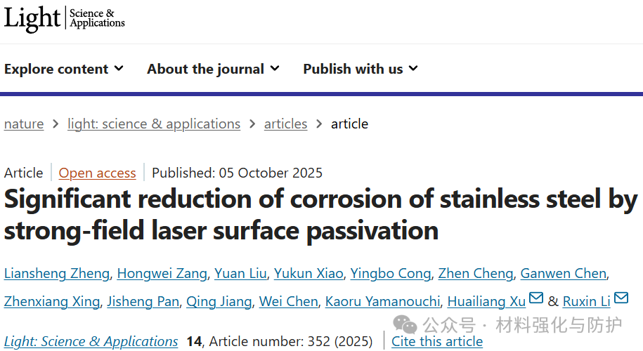 近日,吉林大学集成光电子全国重点实验室联合中科院上海光机所超强激光科学与技术全国重点实验室在《Light: Science & Applications》上发表题为“Significant reduction of corrosion of stainless steel by strong-field laser surface passivation”的研究成果,他们提出了一种全新的强场激光表面钝化策略(Strong-field Laser Filamentation,SLF),通过在不锈钢表面构筑微纳分层结构与复合氧化膜,实现了高达105倍的腐蚀速率降低,在盐、酸、碱等多种腐蚀易发生环境下环境下维持超6500h的超低腐蚀速率,并具备优异的耐磨与结构稳定性。通讯作者为吉林大学的徐淮良教授和中科院上海光机所李儒新。