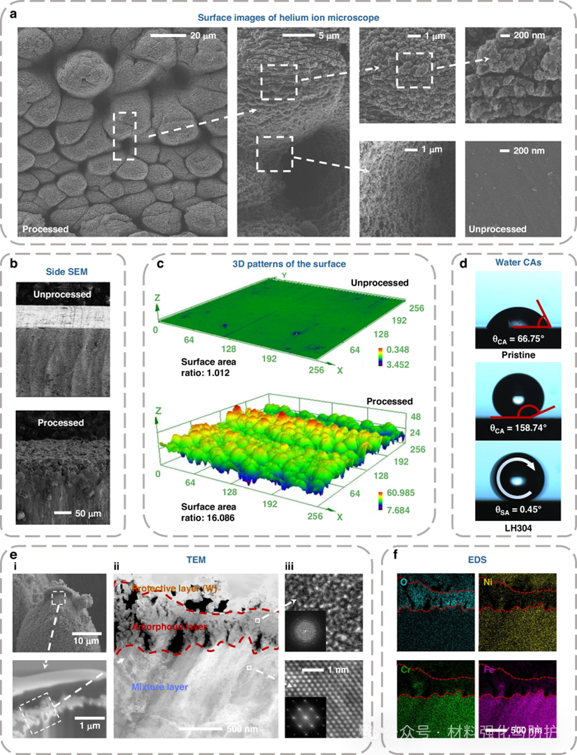 团队采用飞秒激光丝化加工结合低温热处理(150℃),处理后的不锈钢(LH 304)表面形成了仿“芋叶”的微纳层级结构和Fe3O4/Fe2O3/Cr2O3复合氧化膜,这种特殊结构兼具超疏水与高致密特征,可同时抑制电化学反应与离子渗透。