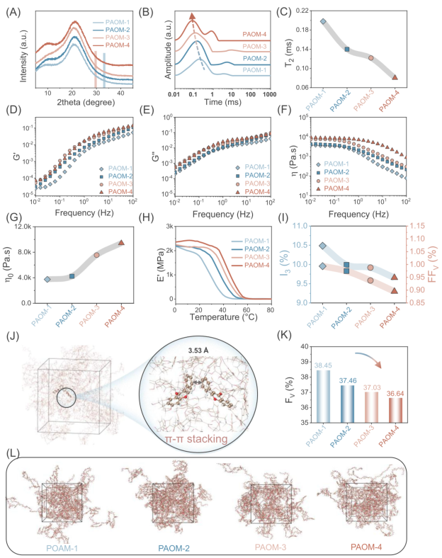 图2 | PAOM的结构表征。 A PAOM的X射线衍射图谱。 B, C PAOM的低场核磁共振曲线和横向弛豫时间分布曲线,图中阴影区域表示参数随掺入量增加的变化趋势。 D–G PAOM的储能模量、损耗模量、复数粘度和零剪切粘度随频率变化的曲线,图中阴影区域表示参数随掺入量增加的变化趋势。 H 聚合物的储能模量随温度变化的曲线。 I PAOM的正电子湮没寿命分析。 J–L 分子动力学模拟揭示了材料内部的π-π堆叠、自由体积分数和分子链模型。
