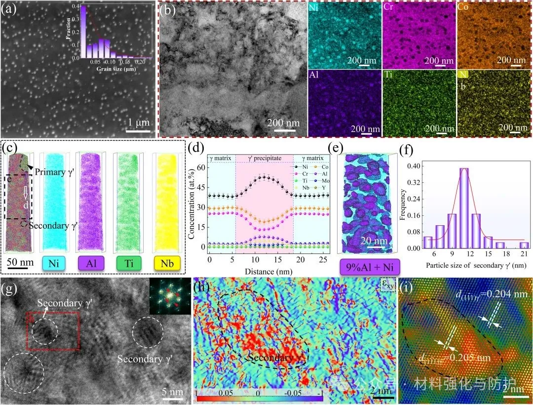 团队通过异步轧制诱导应变累积、980℃退火获得在硬度上差距较大的双峰晶粒结构,并在720-620℃两阶段的时效中实现了尺寸上的双峰γ’析出相分布(粗大初级γ’≈73nm,细小次级γ’≈16nm),这种多尺度异质结构调控的策略显著提升了合金的强化效果与应变协调能力。