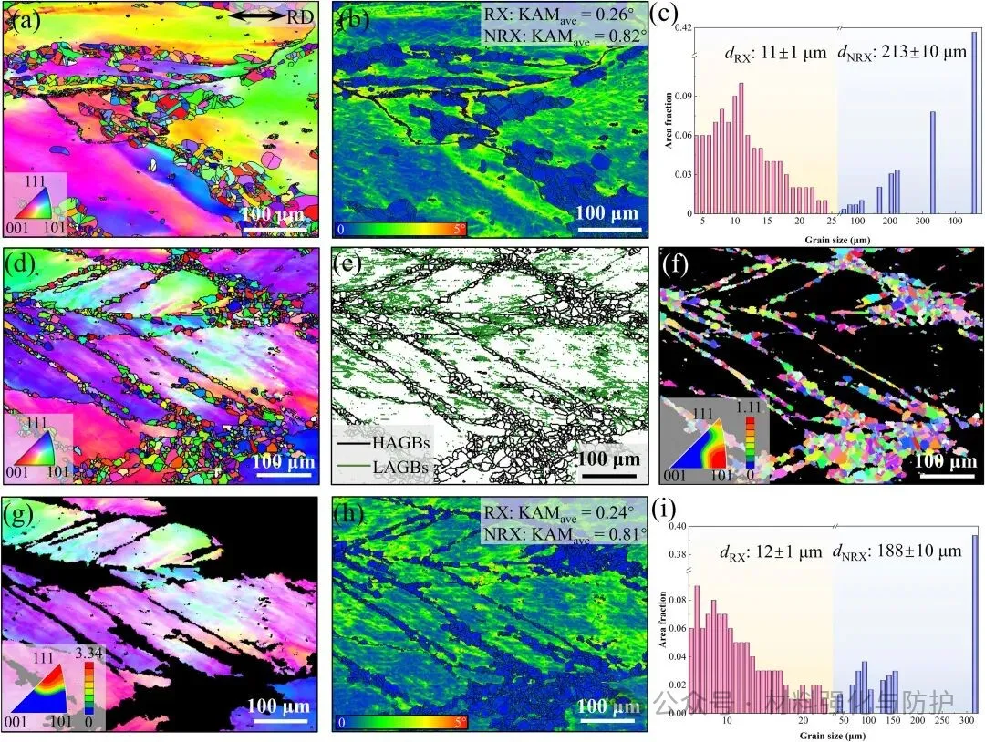 通过真空感应炉制备铸锭后在1200 ℃的空气炉中均质1h,然后直接进行异步轧制(厚度从4mm降至1.5mm),上辊的轧制速度保持在0.8m/s,下辊与上辊的速度比为1.2。轧制后,合金在空气中冷却至室温。然后,将轧制样品在980℃下退火30min,然后空冷至室温,以获得部分再结晶组织,从而形成双峰晶粒度分布。随后,将进行两个阶段的时效,合金的具体时效工艺为:在720 ℃保温8 h以促进析出物的形核和析出,然后以50℃/h的速度冷却至620℃,保温8 h以保持析出物的纳米级特征,时效前后的样品分别命名为AN和AG。