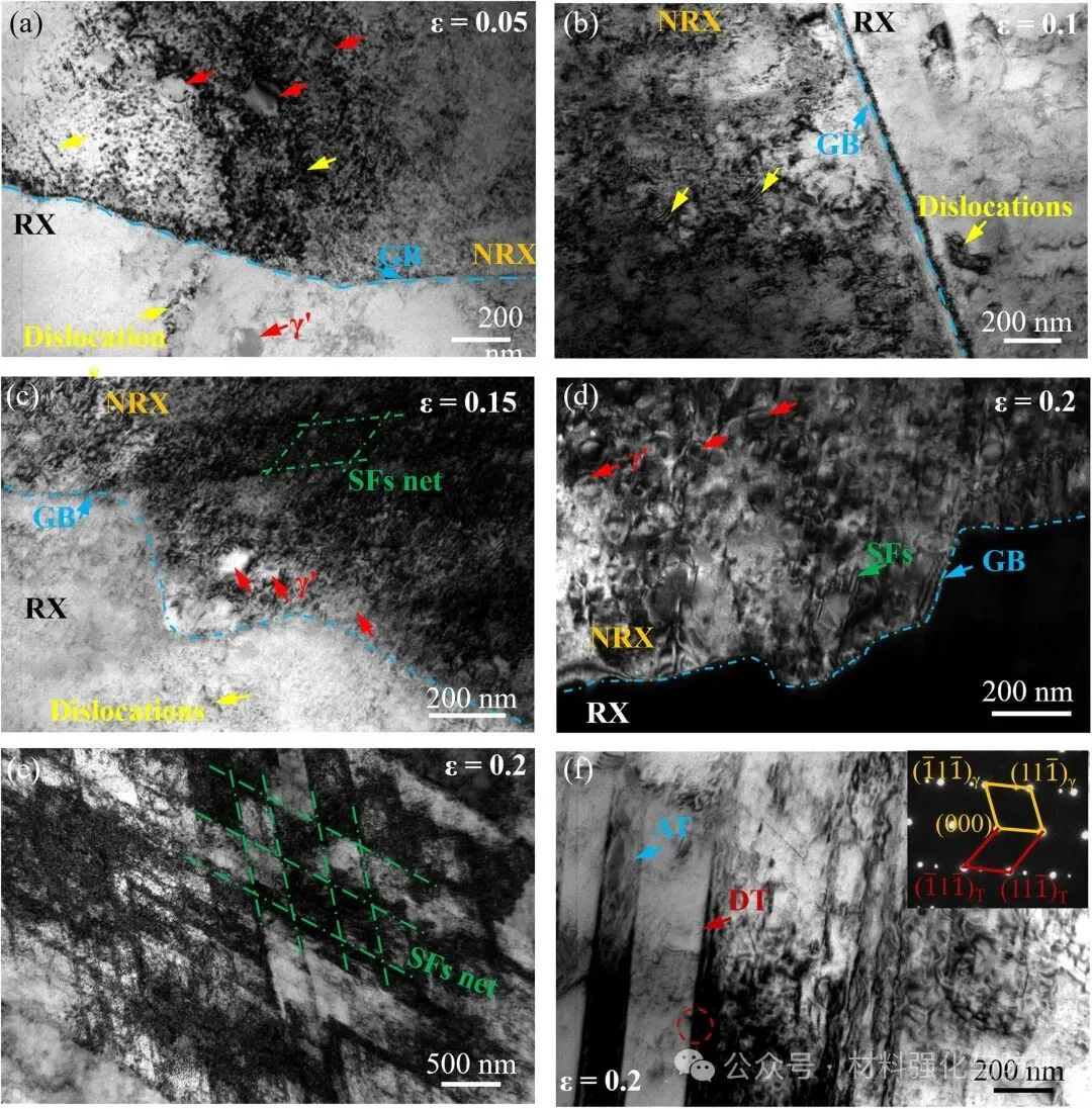 团队发现,随着应变从5%逐渐增加至20%,这一过程汇总合金内部先后激活了多滑移系、Lomer-Cottrell锁、变形孪晶与堆垛层错网络等机制,这些机制协同作用,显著提升了合金的位错累积与应变硬化能力,实现材料高强度与高延展性的平衡。