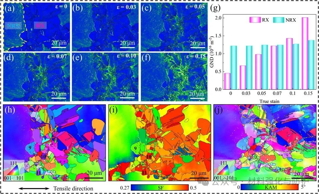 团队通过原位EBSD表征手段发现,在拉伸过程中,合金内再结晶(RX)区的晶粒先行滑移,非再结晶(NRX)区的变形相对滞后,这就造成了两个区域之间的应力分布会有差异,而界面处的晶粒发生显著旋转,这一过程恰好能够有效释放界面的应力集中,也正因如此,合金不至于因异质结构界面的局部应力应变集中导致提前失效,反而维持着与强度适配的塑性。