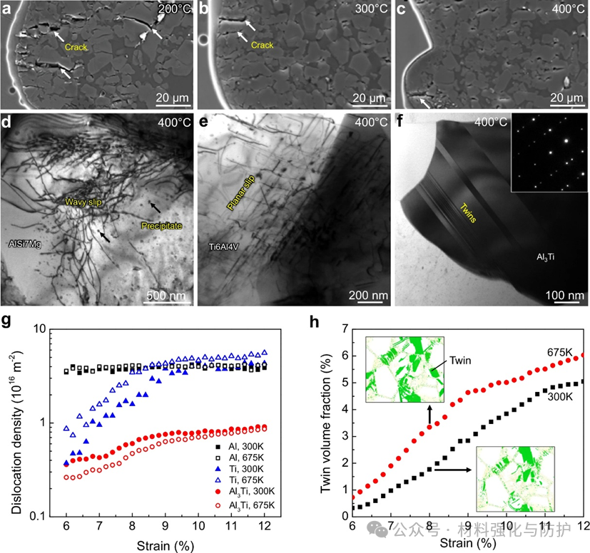 Al₃Ti的异常热孪生效应是RC-AMCs高温抗软化的关键。Al₃Ti具有D0₂₂晶体结构,其孪生行为随温度升高而增强。当温度从25°C升至400°C时,Al₃Ti孪生体积分数从3.8%提升到了5.0%,同时位错密度从0.8×10¹⁶ m⁻²降低为0.7×10¹⁶ m⁻²,有效抑制了铝基体高温下的动态回复与再结晶。