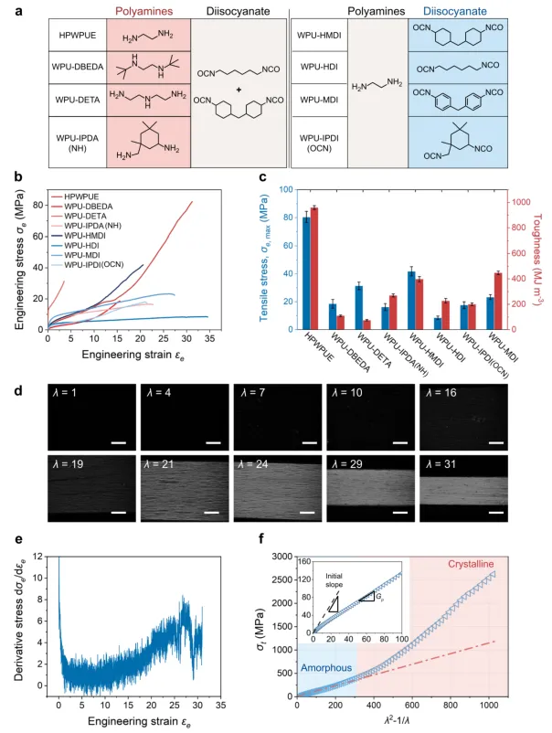图2 | DCR增强的先决条件与HPWPUE相变形 a. HPWPUE及其变体的化学结构,突出不同链延长剂(左)和异氰酸酯(右)段。 b. HPWPUE及其七种变体的应力-应变曲线。 c. HPWPUE及其变体的最大拉伸强度与韧性柱状图,误差棒为三次独立测量的标准差。 d. 不同水平拉伸比下HPWPUE的偏光显微镜图像(分析器垂直方向,比例尺=200 μm)。 e. 微分模量随工程应变变化曲线。 f. 真实应力与(λ²−1/λ)的Haward-Thackray图,插图放大0≤λ²−1/λ≤100范围,蓝色区域代表无定形相,红色区域代表结晶相。