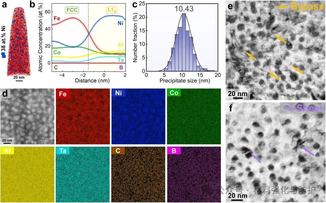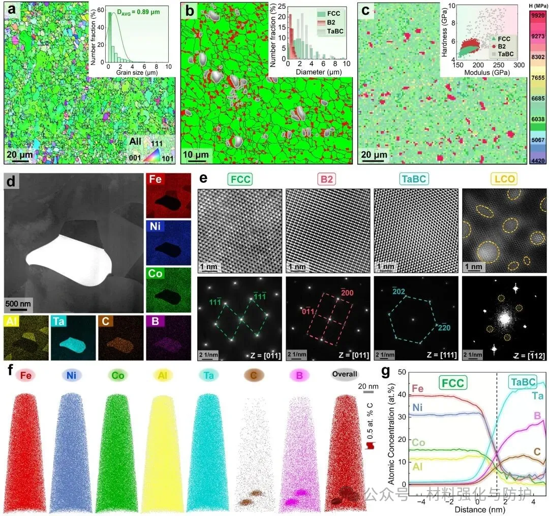 FeNiCoAlTaCB合金展现出独特的层级微观结构,FCC基体中含有细小的LCO区、NiAl型B2相,以及富Ta-B-C的纳米TaBC弥散相,该合金在298K下表现出1836MPa极限强度与20.6%的延伸率,且在873K时仍具备861MPa屈服强度与27.2%延伸率。